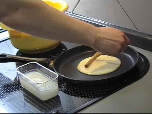 Drehen Sie den Teig zügig in der Pfanne auseinander, um ein festbacken von kleinen Teigklumpen am Teigrechen zu verhindern. Versuchen Sie den Teig möglichst gleichmäßig zu verteilen. Sollten Sie einmal den Teig am Rand verlieren, heben Sie den Teigrechen hoch und setzen neu an. |